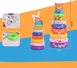 Zabawna i edukacyjna wieża do układania z pierścieniami w różnych rozmiarach i kolorach, uzupełniona uroczym tygryskiem na szczycie. Wspiera motorykę małą, koordynację ręka–oko oraz naukę kolorów, kształtów i rozmiarów. W zestawie znajdują się naklejki ze zwierzętami do kreatywnej personalizacji.