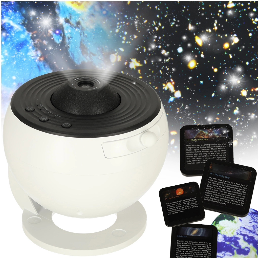 W zestawie znajduje się 12 wymiennych dysków z angielskimi opisami – na przykład Ziemia, Układ Słoneczny, Droga Mleczna czy Księżyc. Dzięki temu projektor świetnie sprawdza się w nauce poprzez zabawę i rozbudza ciekawość astronomią u dzieci i dorosłych.