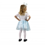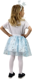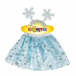 Niebieska spódnica z połyskującymi śnieżynkami i satynowym pasem wprowadza zimową magię.