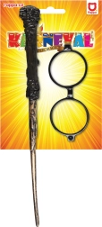 Ten zestaw czarodziejski obejmuje stylowe okrągłe okulary oraz autentyczną plastikową różdżkę o długości około 40 cm. Oba elementy pomagają stworzyć przekonujący czarodziejski kostium.