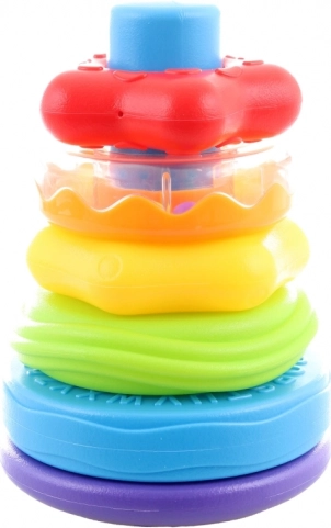 Kolorowe krążki o różnej wielkości uczą rozróżniania kształtów i barw, rozwijają małą motorykę oraz cierpliwość podczas nakładania na drążek.