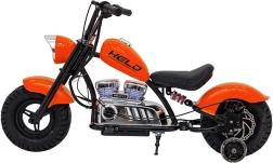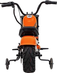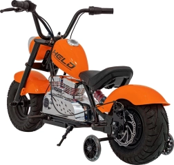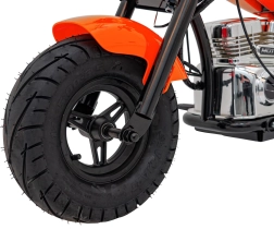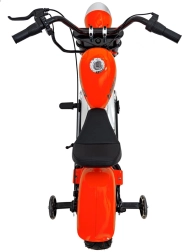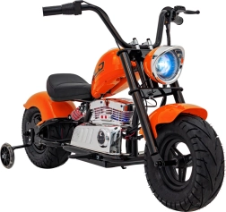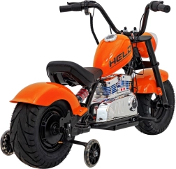 Elektryczny motocykl chopper Warrior w kolorze pomarańczowym oferuje dzieciom autentyczne wrażenia z jazdy. Mocny bezszczotkowy silnik 350 W w połączeniu z systemem akumulatorów 36 V zapewnia płynne przyspieszenie sterowane obrotową manetką. Szerokie, pompowane opony 32 × 10 cm gwarantują dobrą przyczepność i komfort, a kółka boczne pomagają początkującym utrzymać stabilność.