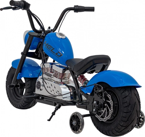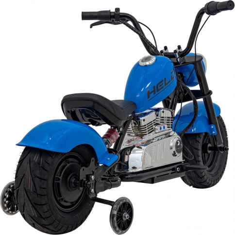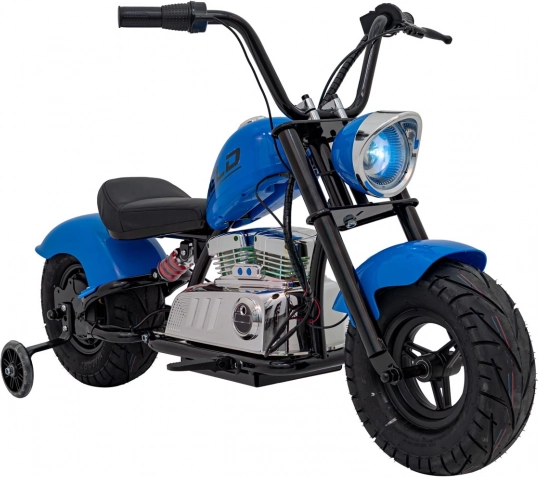 Stylowy dziecięcy elektryczny motocykl w stylu choppera oferuje mocny bezszczotkowy silnik 350 W, baterię 36 V, pompowane koła oraz boczne kółka stabilizujące dla bezpiecznych pierwszych przejażdżek. Nie brakuje światła LED, dźwięków silnika oraz panelu audio z MP3/USB dla jeszcze większej zabawy.