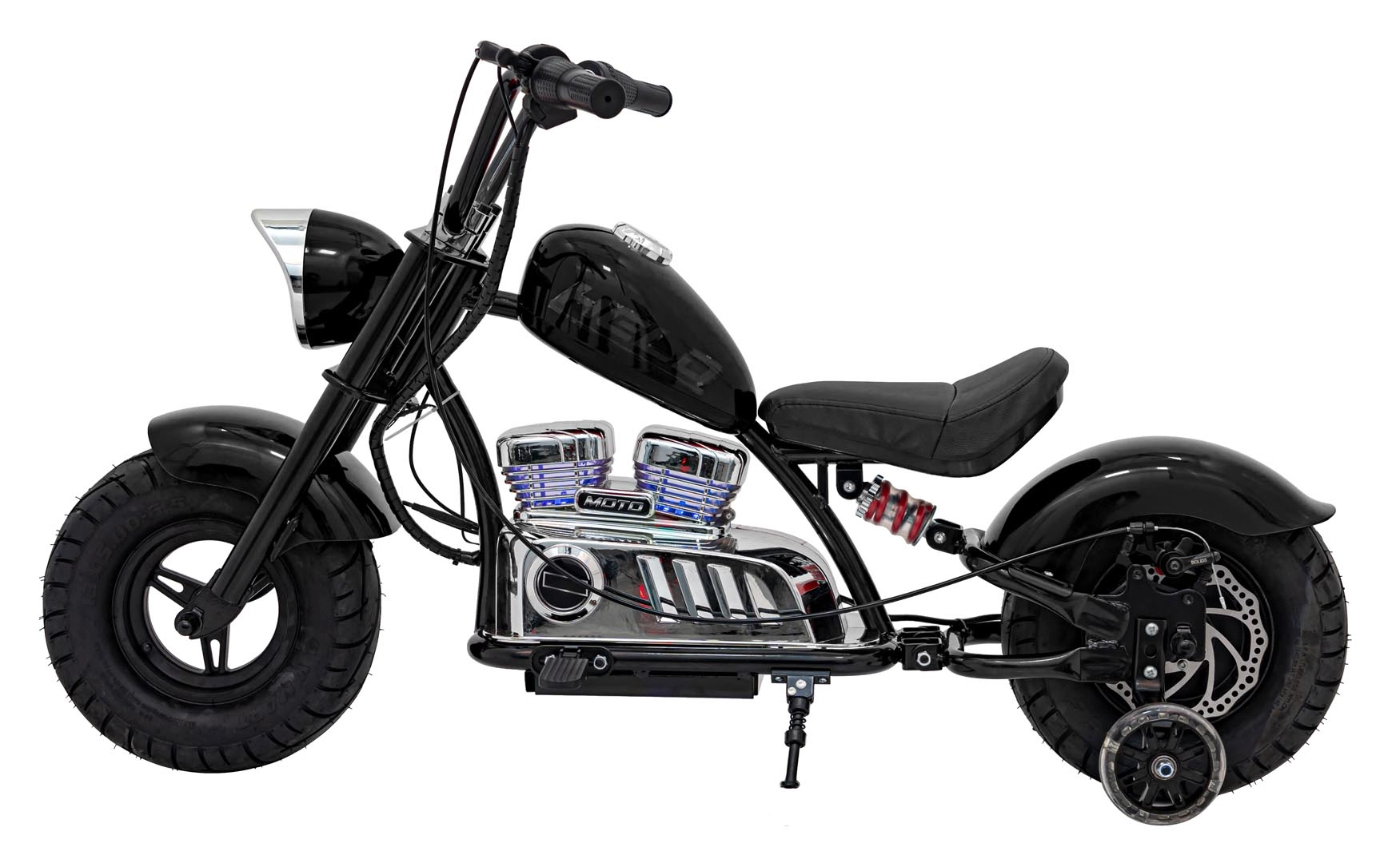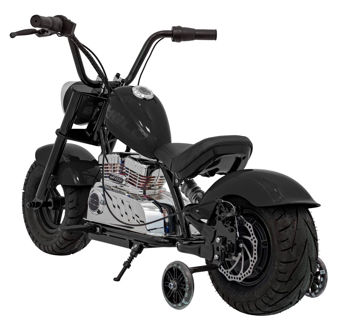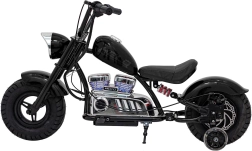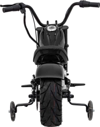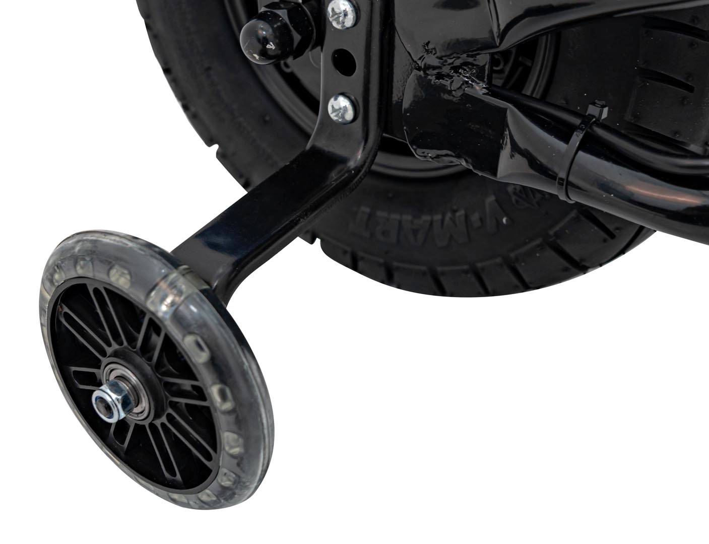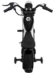 Dla bezpieczeństwa początkujących motocykl wyposażono w boczne kółka, które pomagają w utrzymaniu równowagi. Przednie światło LED i dekoracyjnie podświetlany „silnik” dodają atrakcyjnego wyglądu i poprawiają widoczność. Komfortowe, szerokie siedzisko z eko skóry zapewnia wygodę także podczas dłuższej jazdy.