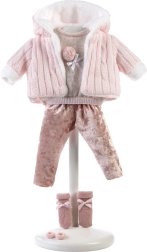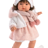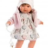 Głowa i kończyny są wykonane z wysokiej jakości miękkiego winylu. Po wyciągnięciu smoczka usłyszysz frazy takie jak „mama” i „tata” wraz z realistycznym płaczem, który można uspokoić dzięki magnetycznemu smoczkowi. Ten model jest bez ubrania – idealnie pasuje do oryginalnego ubrania Llorens dla lalek tej wielkości. Lalka jest zapakowana w foliowe opakowanie. Zestaw zawiera baterie 3 x guzikowe LR44 z instrukcją wymiany.