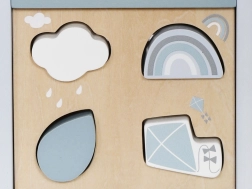 - Zestaw kształtów: Zawiera różne kształty i kolory, które dziecko może wkładać do odpowiadających im otworów, co pomaga w rozpoznawaniu kształtów i koordynacji wzrokowo-ruchowej.