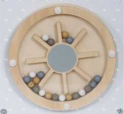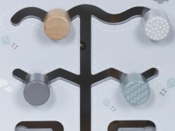 - Górna część: Zawiera tory z koralikami na drucianych pętlach, które pomagają dziecku ćwiczyć precyzyjne ruchy rąk i koncentrację.