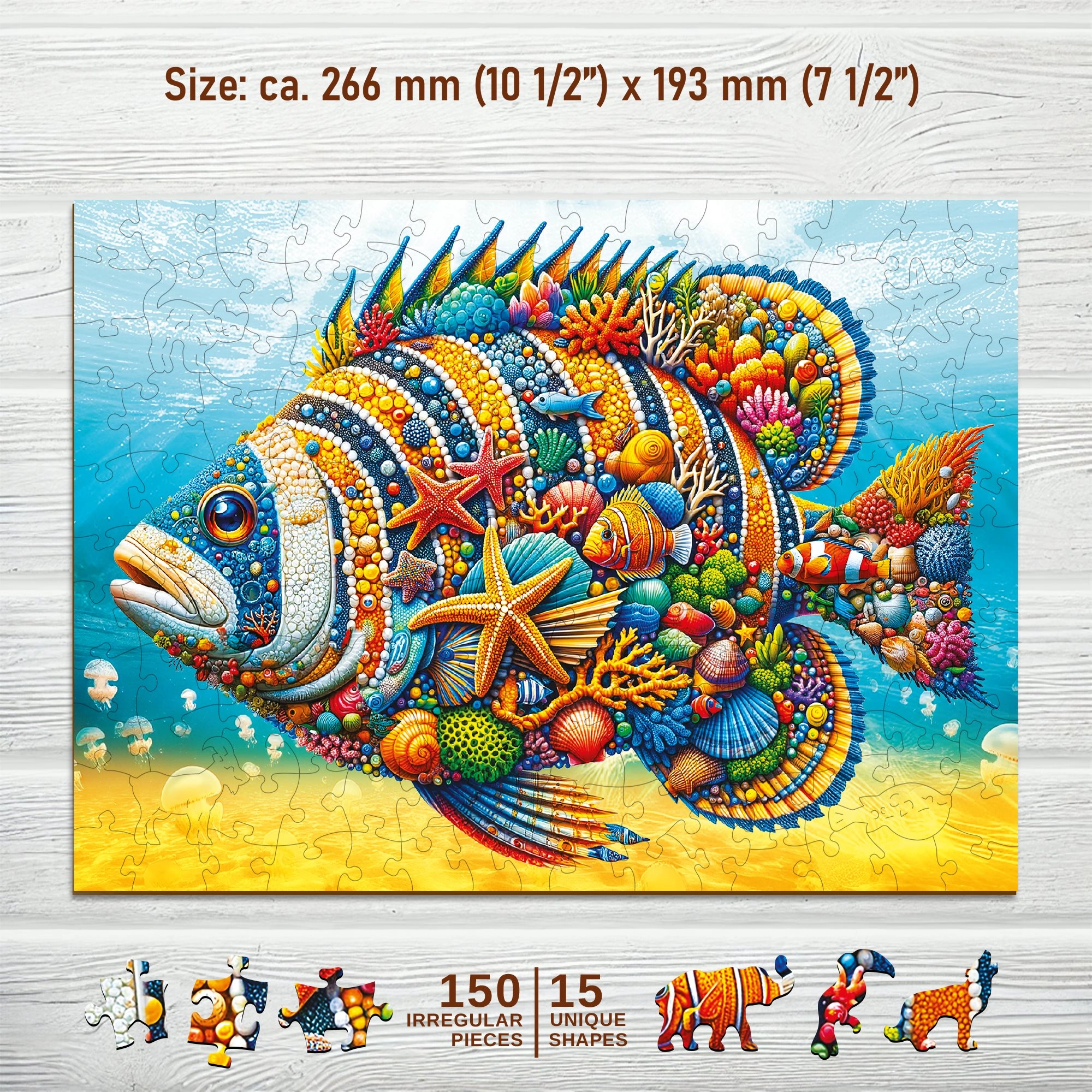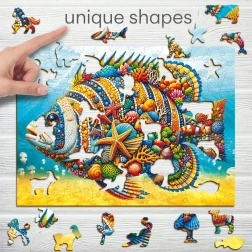 Drewniane puzzle Modna ryba od WOODEN CITY to świetne wyzwanie dzięki specjalnie ukształtowanym elementom, z których niektóre mają formę zwierząt. Te figurki mogą stać samodzielnie, co wzbogaca doświadczenie układania. Puzzle wykonano z wytrzymałej płyty HDF z włókien drzewnych o grubości 3–4 mm, co zapewnia odporność i wysoką jakość. Gładkie, bezdrzazgowe krawędzie gwarantuje precyzyjna obróbka laserowa.