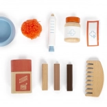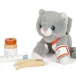 Drewniana strzykawka ze sprężynowym mechanizmem, pojemnik na lekarstwa i inne przybory wspierają autentyczną zabawę w leczenie pupila.