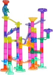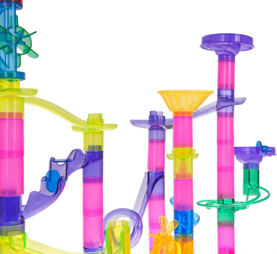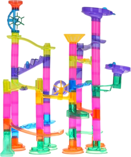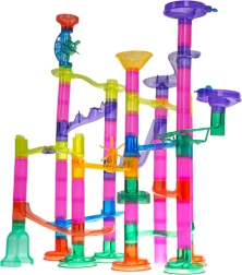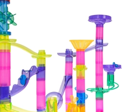 Kolorowy i stabilny tor kulkowy z przezroczystych elementów daje dzieciom radość z odkrywania ruchu, grawitacji oraz zależności przyczyna–skutek. Dzieci samodzielnie projektują i budują konstrukcje, a następnie obserwują, jak kulki pędzą przez tunele, spirale i lejki. Migające kulki zasilane bateriami dodają każdemu przejazdowi efektownych świetlnych wrażeń.