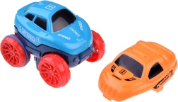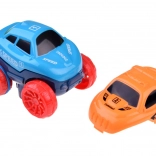 Autko z akumulatorem do ładowania i oświetleniem LED po naciśnięciu przycisku rusza samo. Gumowe paski na tylnych kołach zwiększają trakcję na torze.