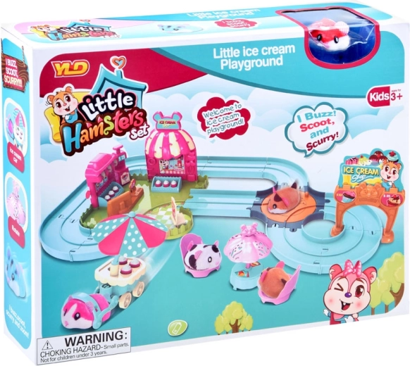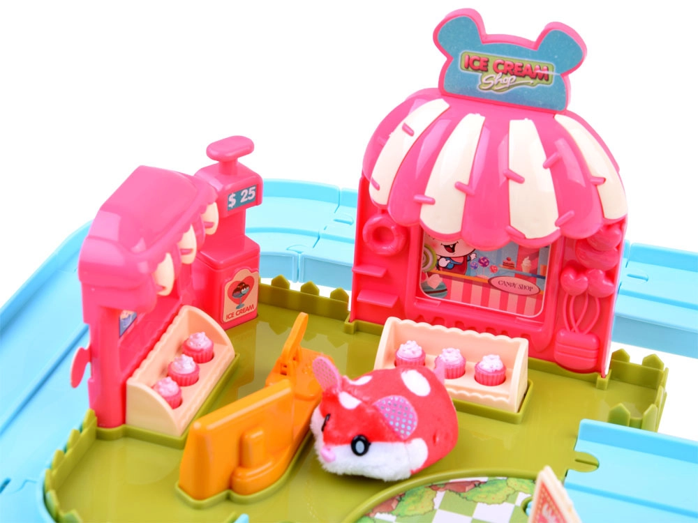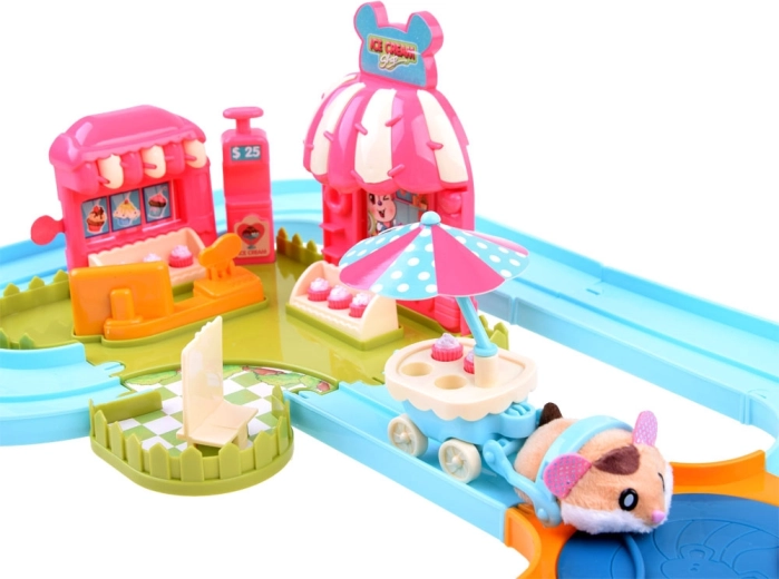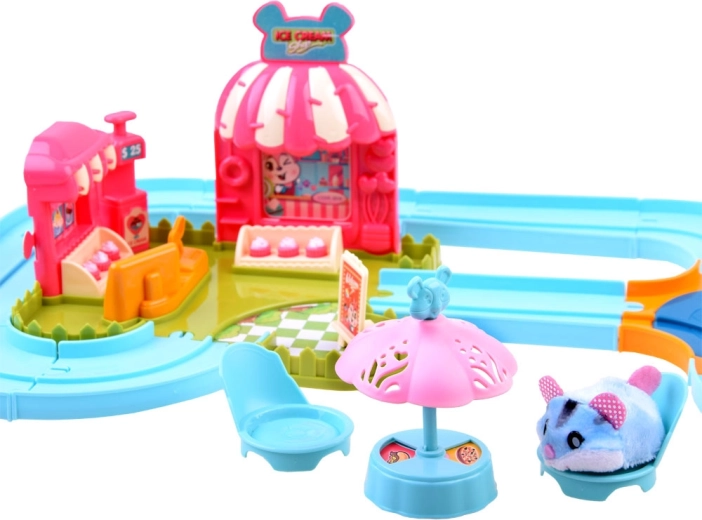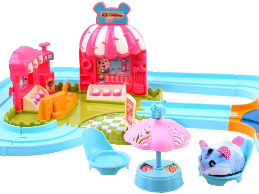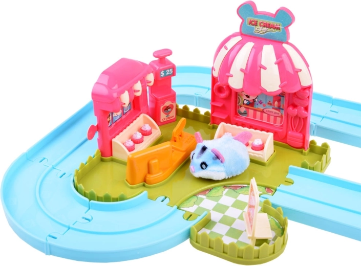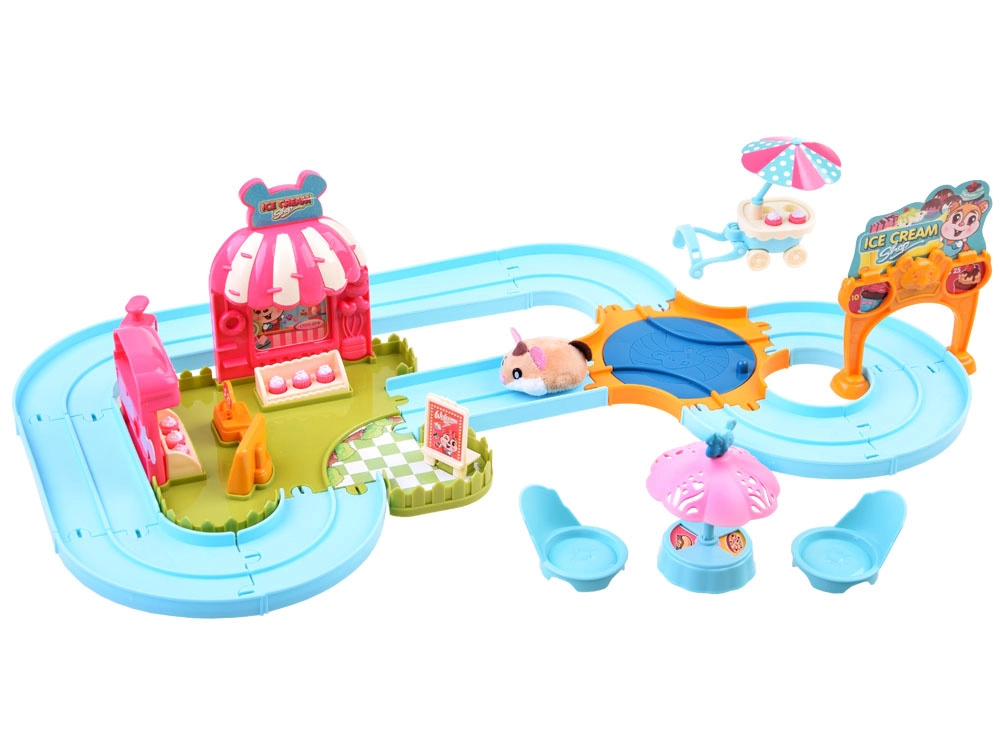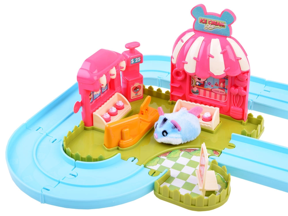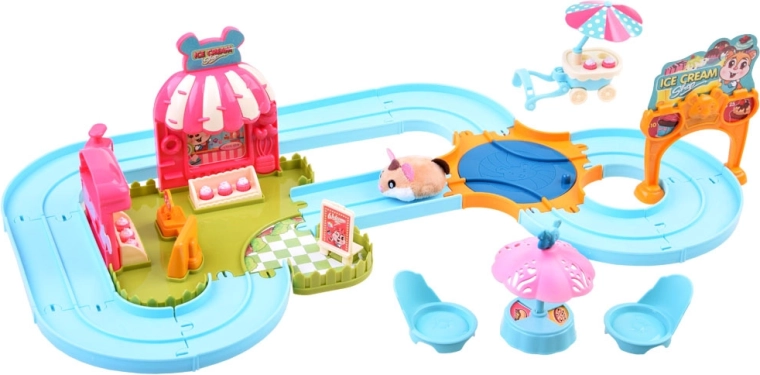 Ten zestaw przenosi do zabawnego świata lodziarni z uroczym chomikiem, który ma mięciutkie futerko i jest gotowy do akcji od razu po rozpakowaniu – zasilanie baterią AG13 (w zestawie). Po włączeniu chomik rusza, samoczynnie zmienia kierunek i można go prowadzić po dołączonym łatwym w montażu torze z rozjazdem. Z podłączonym wózkiem rozwozi smakołyki dla gości.