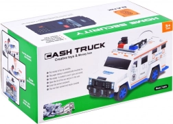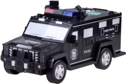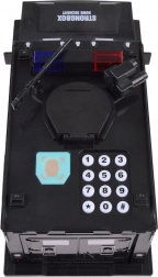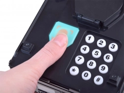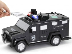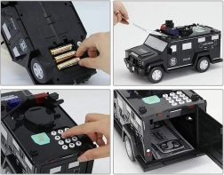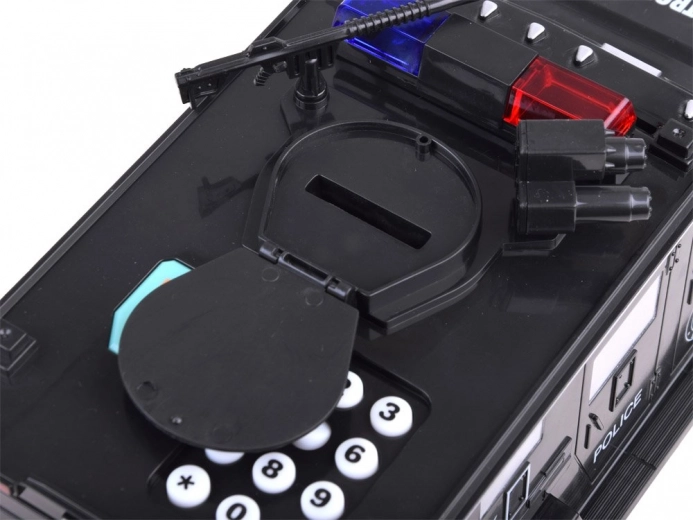 Ta interaktywna skarbonka w kształcie policyjnego auta chroni dziecięce oszczędności i jednocześnie bawi. Dzieci mogą wprowadzić kod bezpieczeństwa (domyślnie 0000), potwierdzić go dotknięciem skanera odcisku palca (symulacja) i otworzyć drzwiczki sejfu. Banknoty są automatycznie wciągane przednim slotem, monety wrzuca się górnym otworem pod pokrywą.