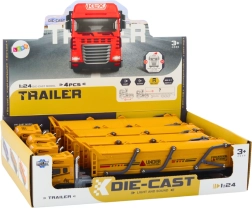 Ciężarówka z żółtą naczepą to realistyczna zabawka przeznaczona dla małych entuzjastów pojazdów ciężarowych. Model wykonany jest w skali 1:24 i dzięki szczegółowemu wykonaniu przypomina prawdziwy samochód dostawczy. Ciężarówka posiada napęd nawijany, więc po poruszeniu do przodu lub do tyłu porusza się płynnie własną siłą. Po naciśnięciu kabiny aktywują się efekty świetlne i dźwiękowe, które dodają autentyczności i zabawy podczas gry.