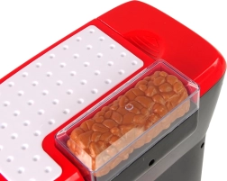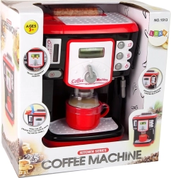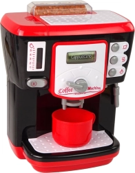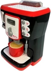 Czarno‑czerwony ekspres to naprawdę interesująca zabawka. Wyglądem nawiązuje do nowoczesnych automatów, więc może śmiało stać w kuchni obok swojego oryginału. Zabawka jest wyposażona w przycisk do przełączania rodzajów przygotowywanej kawy – Cappuccino, Latte i Macchiato. Po lewej stronie ekspresu znajduje się zbiornik, po którego przełączeniu przyciskiem z automatu zaczyna wypływać woda! Po prawej stronie znajdują się z kolei przyciski symulujące różne tryby pracy ekspresu. Zestaw zawiera także imitację ziaren kawy w zasobniku oraz filiżankę, którą można napełnić przy użyciu ekspresu.