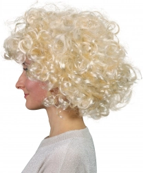 Sztuczna peruka, która wiernie naśladuje naturalne ludzkie włosy z objętościowymi, starannie ukształtowanymi lokami.