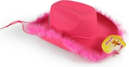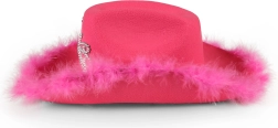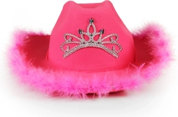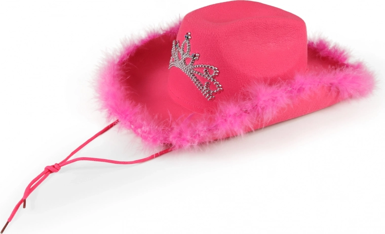 Jaskrawo różowy kapelusz kowbojski dla dorosłych z koroną z kryształków i obszyciem z piórek doda każdej imprezie odrobinę glamuru. Dzięki regulowanemu sznurkowi wygodnie trzyma się na głowie, a wysokość kapelusza to 15 cm – idealny na imprezy, karnawał czy wieczór panieński.