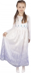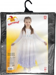 Stylowy dziewczęcy kostium zimowej królowej zachwyca baśniowym wyglądem dzięki połączeniu bieli, fioletowych tonów i blasku. Górna część jest ozdobiona cekinami, od pasa rozchodzi się zwiewna tiulowa spódnica z delikatnym nadrukiem, a całość dopełnia tren z dekoracjami.