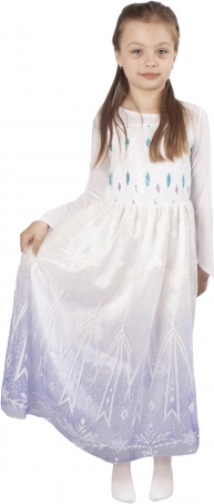 Zamień małą księżniczkę w zachwycającą zimową królową. Długa biała sukienka z połyskującymi cekinami, biało‑fioletową tiulową spódnicą z nadrukiem oraz elegancką treną zachwyci na balu przebierańców, przyjęciach i podczas magicznej zabawy w domu. Idealna dla wieku 6–8 lat (117–128 cm).