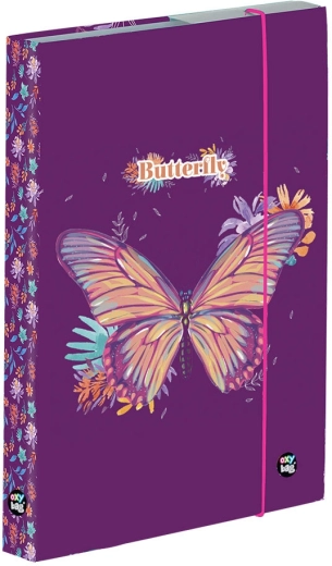 Praktyczne szkolne pudełko na zeszyty w formacie A5 z motywem motyla. Chroni Twoje zeszyty i papiery dzięki wytrzymałemu laminatowi, ma zapięcie na gumkę oraz grzbiet o szerokości 3 cm na więcej zawartości.