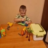 Składanie dinozaurów za pomocą wiertarki i śrubokrętu rozwija małą motorykę dzieci oraz ich logiczne myślenie.