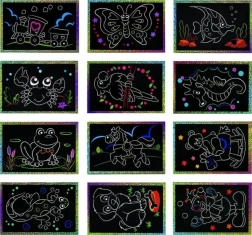 Ten zestaw zdrapywanych obrazków to idealny wybór na pierwsze kreatywne działania. Prosta zasada ścierania całego motywu bez skomplikowanych detali jest łatwa do zrozumienia, a efekt widać od razu: piękne brokatowe i kolorowe obrazki, które efektownie się błyszczą.