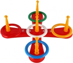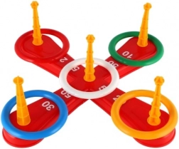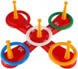Gra zawiera krzyżową podstawę i kolorowe obręcze do zabawnego rzucania.