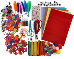 Rozwijaj dziecięcą wyobraźnię dzięki bogatemu zestawowi kreatywnemu w praktycznym plastikowym pojemniku. Zawiera samoprzylepne oczka, piórka, brokatowy klej, kartony, nożyczki i inne materiały do tworzenia. Idealny dla dzieci od 3 lat do wykonywania figurek, dekoracji i obrazków.