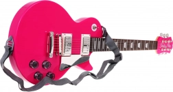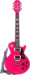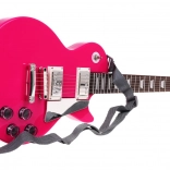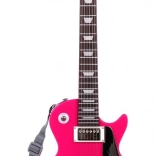 Różowa gitara elektryczna z paskiem wygodnie leży na ciele dziecka i wyglądem przypomina prawdziwy instrument.