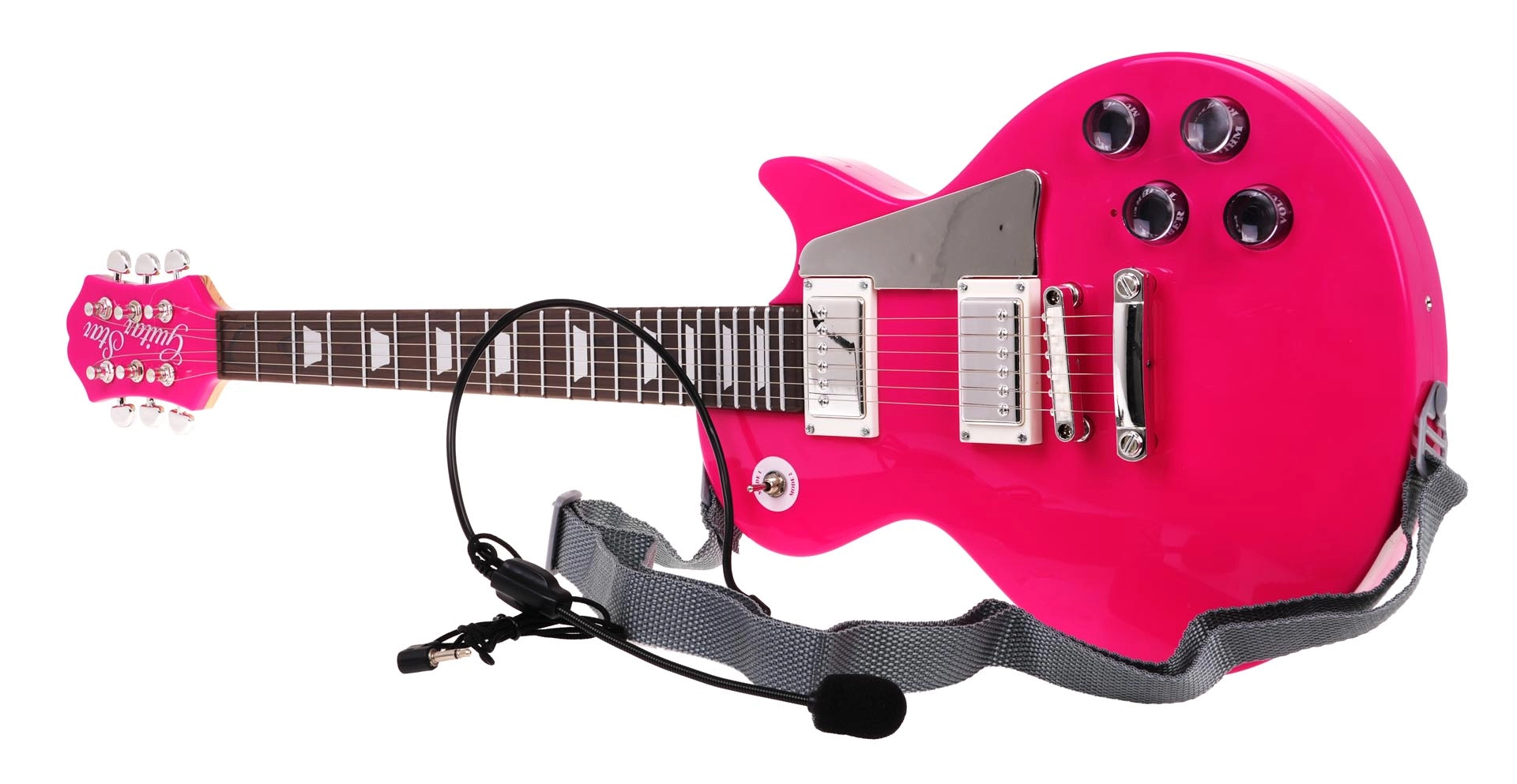 - Różowa gitara elektryczna, słuchawki z mikrofonem, pasek