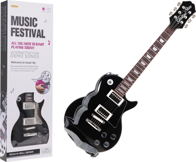 Zabawna dziecięca gitara elektryczna z mikrofonem nagłownym dla małych muzyków od 3 lat. Oferuje regulację głośności, wybór rytmów i gotowe melodie, realistyczny wygląd oraz regulowany pasek dla wygodnej gry. Zabawa, która rozwija poczucie rytmu i małą motorykę.