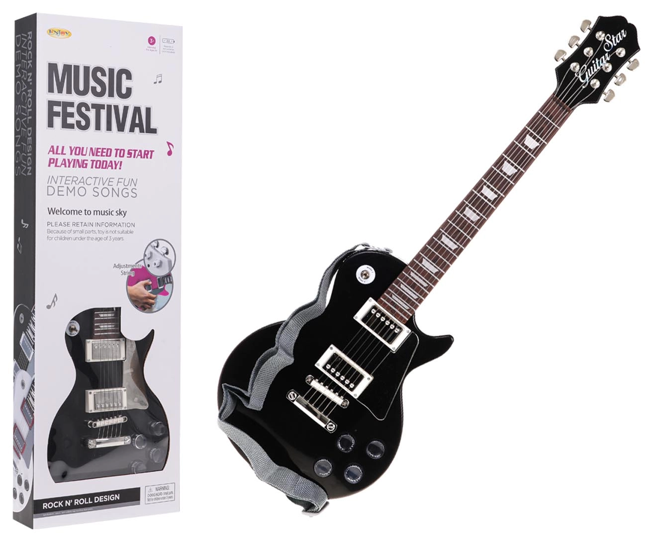 W zestawie znajduje się mikrofon nagłowny, który można podłączyć bezpośrednio do gitary – Twoje dziecko stanie się gwiazdą własnego koncertu. Trwałe wykonanie, lekka konstrukcja i pasek umożliwiają grę na stojąco i siedząco.