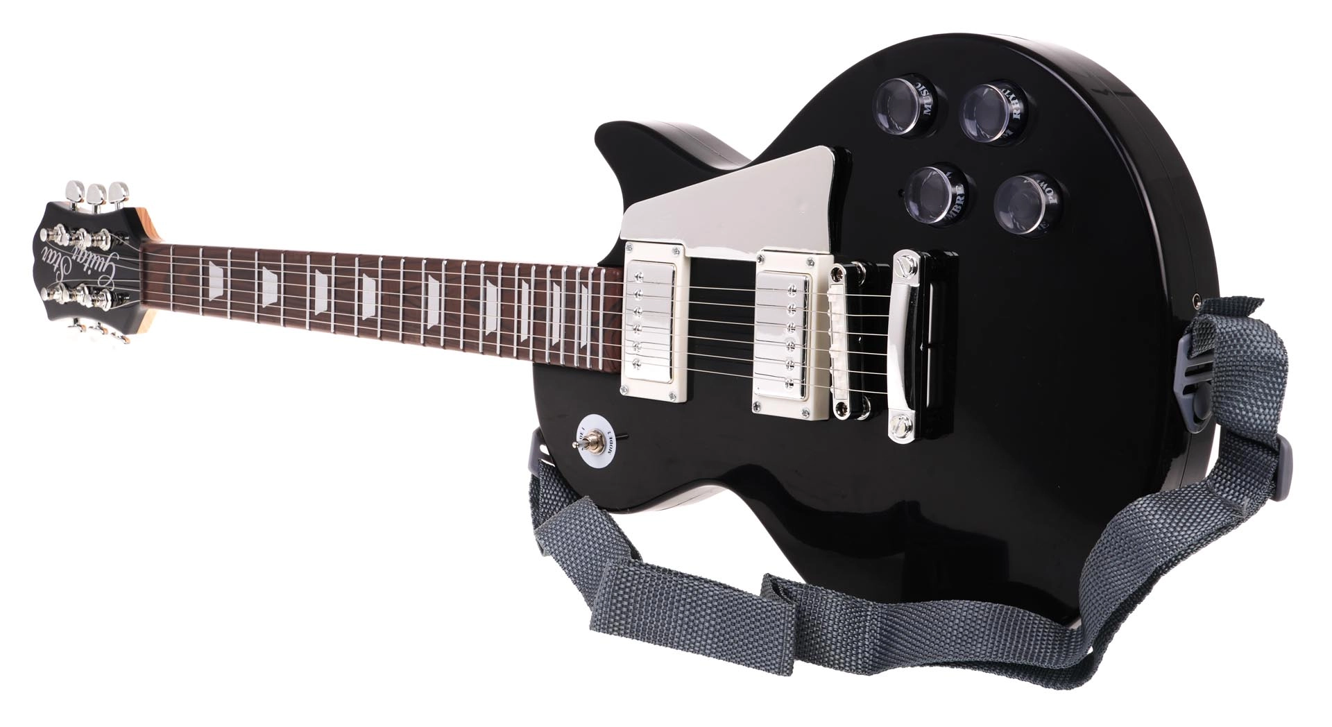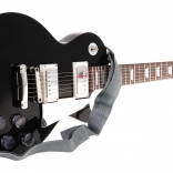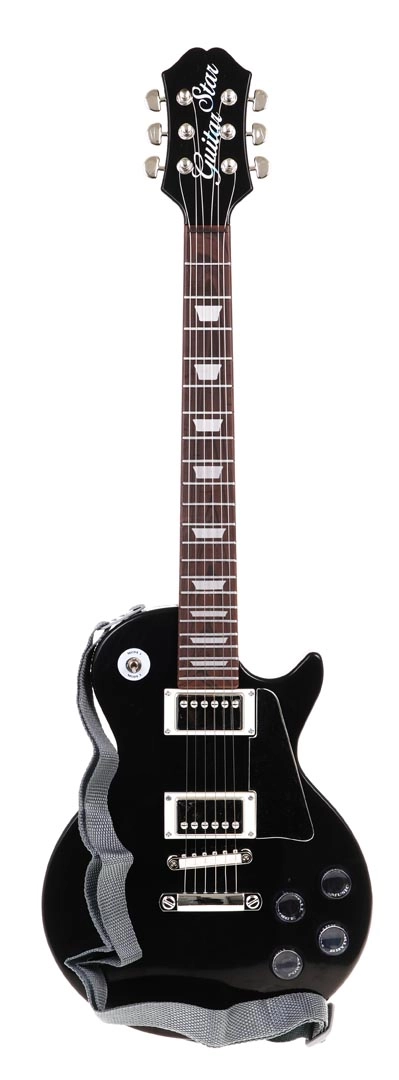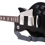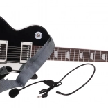- czarna gitara elektryczna, mikrofon nagłowny, pasek