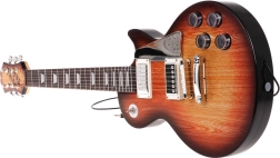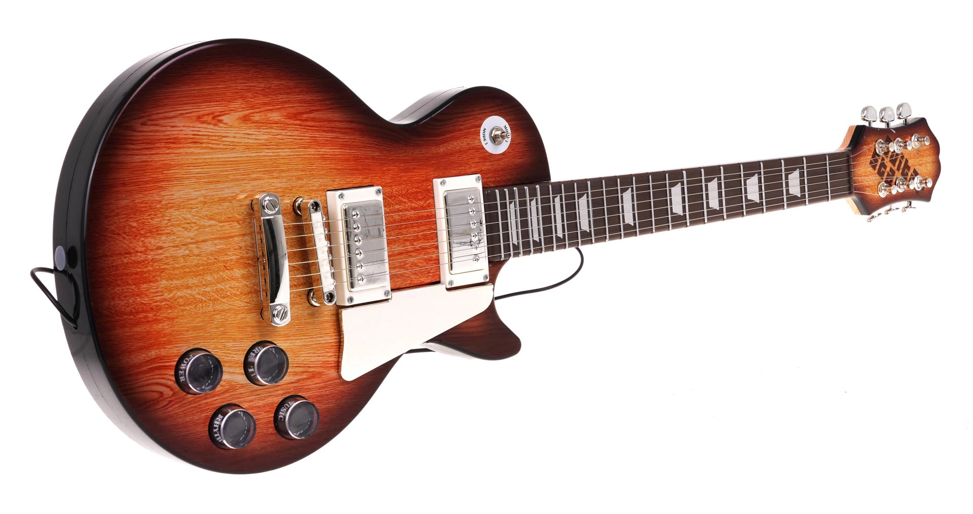 Gitara w brązowym stylu „sunburst” z elementami sterującymi i paskiem zachęca dzieci do muzykowania. Zaprogramowane rytmy i melodie pomagają w pierwszych krokach.