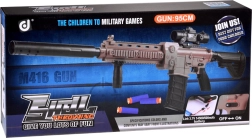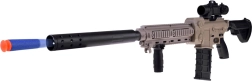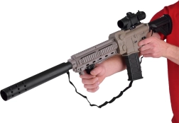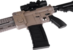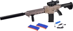 Lekka konstrukcja z wytrzymałego plastiku oraz regulowany przedni chwyt zwiększają komfort podczas gry. Przesuwna optyka pomaga w celniejszych trafieniach na dłuższy dystans, a odłączany magazynek umożliwia szybkie uzupełnianie amunicji. W zestawie znajduje się akumulator 3,7 V/500 mAh oraz ładowarka, więc możesz ruszać do akcji zaraz po naładowaniu.