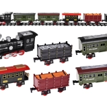 W zestawie znajdziesz 12 elementów torów, trzy wagony osobowe i dwa towarowe do różnorodnych konfiguracji.