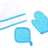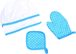 Czapka na gumkę, fartuch z kieszenią oraz rękawica termiczna z podkładką chronią ubrania i dłonie, a dzieci czują się jak prawdziwi kucharze.
