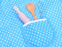 - Fartuch, czapka kucharska, rękawica, tekstylna podkładka, drewniany wałek, drewniana łyżka, metalowa trzepaczka, 4 metalowe foremki do wykrawania