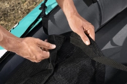 Praktyczne detale, takie jak lina bezpieczeństwa wokół całego obwodu, przestrzeń bagażowa i wyjmowana torba, ułatwiają organizację wyposażenia. Do szybkiego przygotowania do wodowania służy dołączona ręczna pompka, a po dopłynięciu kajak łatwo spuścisz z powietrza i kompaktowo przechowasz.