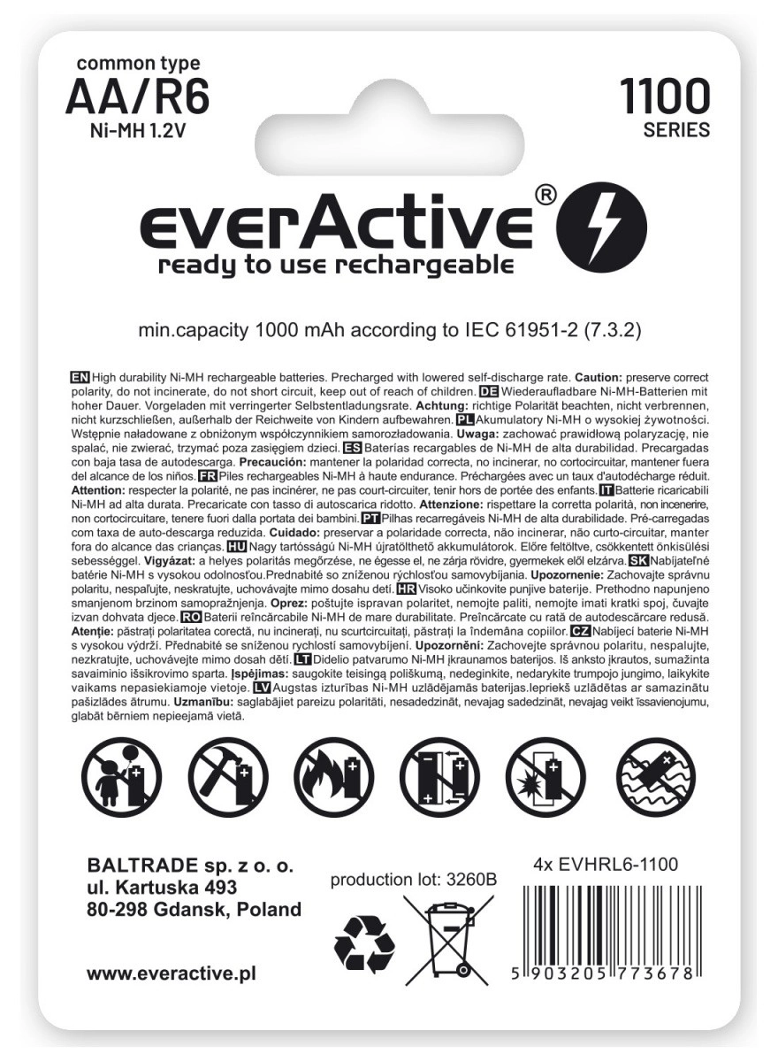 Odkryj innowacyjne akumulatory R6 AA 1100 mAh marki EverActive, które są częścią serii Infinity Line. Te baterie do ładowania zostały opracowane z technologią "ready to use", co oznacza, że są wstępnie naładowane i gotowe do natychmiastowego użycia: