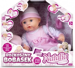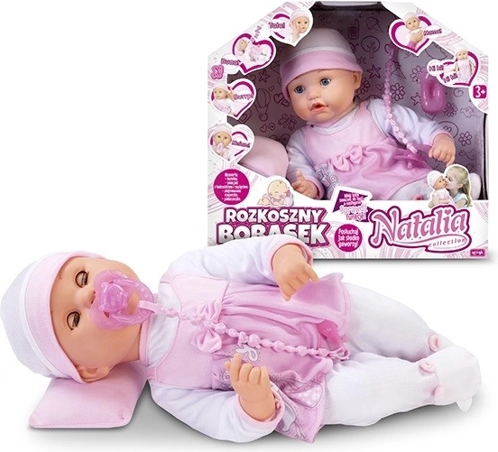 Interaktywne niemowlę z akcesoriami Natalia Collection jest jak prawdziwe: reaguje na dotyk i ruch, wydaje realistyczne dźwięki (śmiech, płacz, sen), mówi „mama” i „tata”, a po karmieniu z butelki odbija. Miękkie ciałko, smoczek i poduszeczka w zestawie – idealna zabawka dla dzieci od 2 lat.
