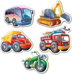 Ten zestaw zawiera pięć progresywnych układanek z motywami ulubionych pojazdów – od autobusu po wóz strażacki. Dzięki stopniowo rosnącej trudności (3, 4 i 5 elementów) dzieci naturalnie trenują logiczne myślenie i cierpliwość. Wesołe kolory i przyjazne ilustracje utrzymują ich uwagę i wspierają radość z odkrywania.