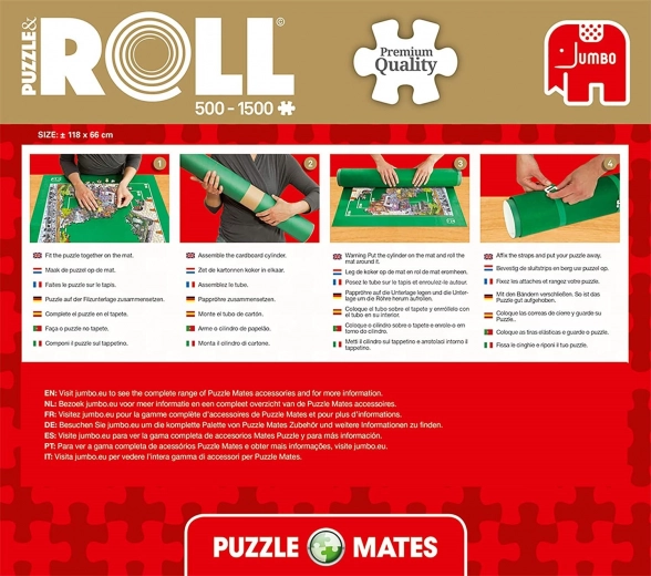 Rolowana mata do puzzli JUMBO dla 500–1500 elementów. Wymiary 118 × 66 cm, oznaczenia, tuby i paski do bezpiecznego rolowania, łatwe przechowywanie i transport.