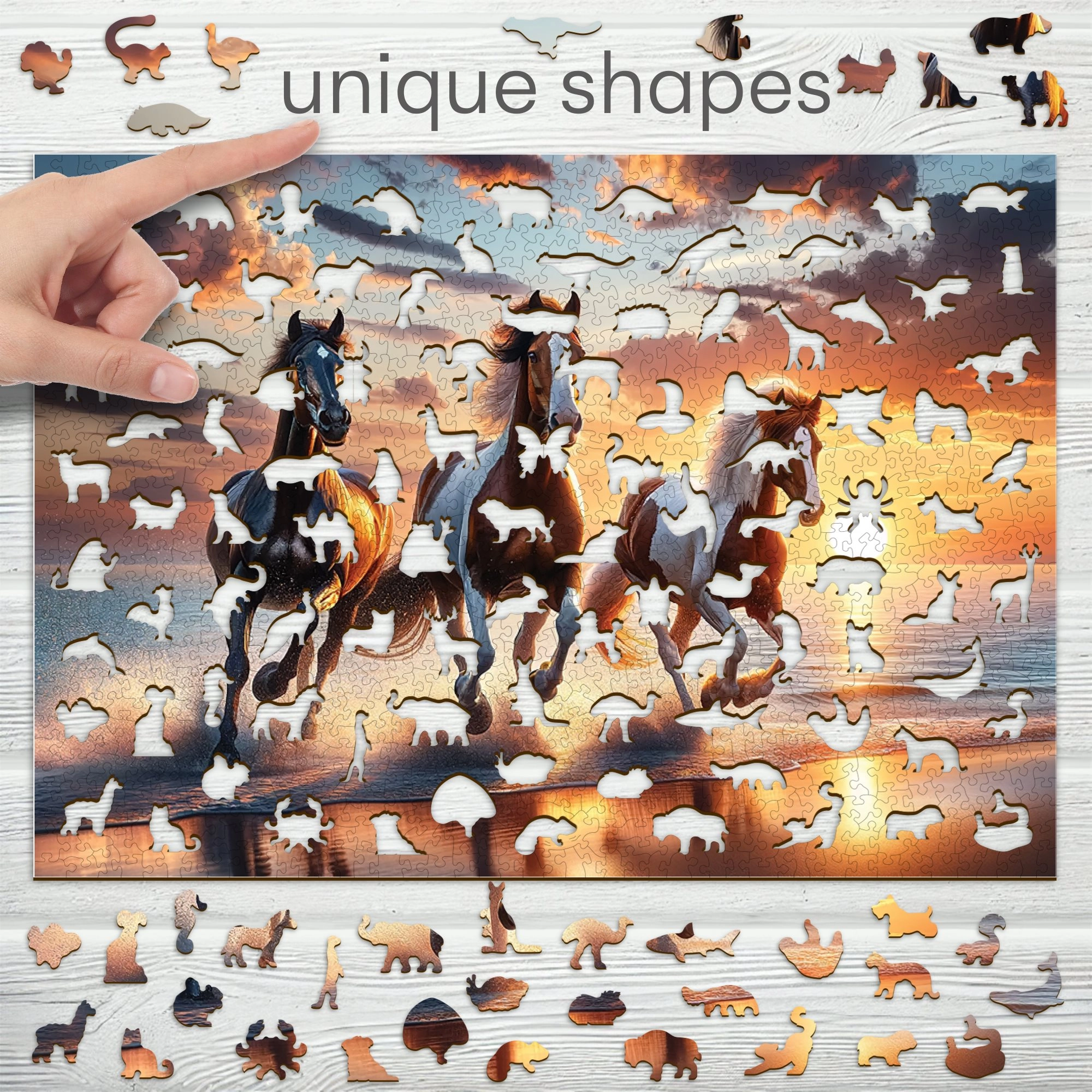 Wejdź do świata wysokiej jakości drewnianych puzzli z motywem dzikich koni na plaży. WOODEN CITY oferuje elementy wycinane laserowo z wytrzymałej płyty HDF o grubości 3–4 mm, wyróżniające się gładkimi krawędziami i długą żywotnością. Część elementów ma kształt zwierząt i dzięki dopracowanym detalom może służyć także jako małe figurki.