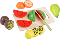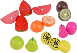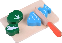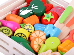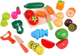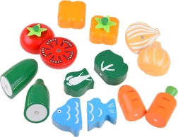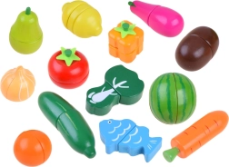 Ten drewniany zestaw zawiera różnorodny wybór owoców, warzyw i ryby, wszystkie wyposażone w magnesy ułatwiające dzielenie na części. Każdy element jest wykonany z wysokiej jakości drewna i pomalowany nietoksycznymi farbami, które zapewniają bezpieczeństwo dla najmłodszych.