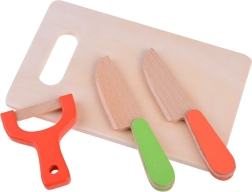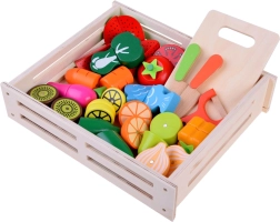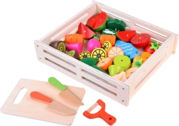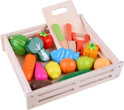 Zawartość opakowania: Drewniana skrzynka, deska do krojenia, dwustronny nóż, obieraczka, różne rodzaje owoców i warzyw, takie jak pomidor, marchew, ogórek, papryki, truskawki, kiwi i inne.