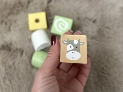 Zawiera różne klocki o kształtach i wzorach, które wspierają rozwój zdolności manualnych i wyobraźni.