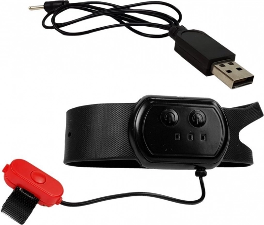 Opaskę naładujesz przez USB, zabawa trwa do 2 godzin. Sama wywrotka jest zasilana 4× AA 1,5 V, co ułatwia wymianę baterii.
