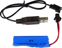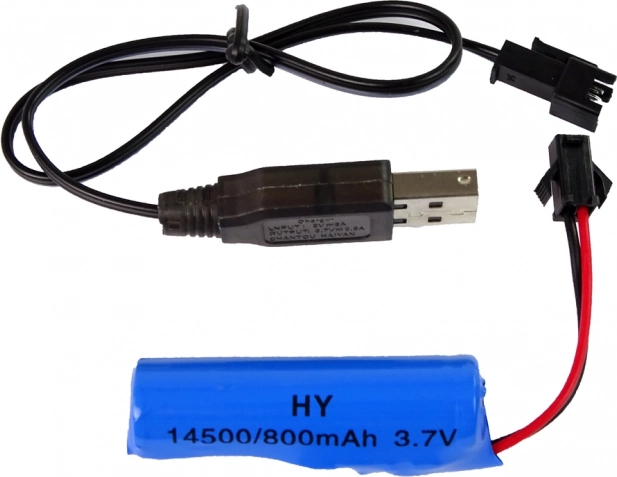 W zestawie akumulator Li-ion 3,7 V 500 mAh w traktorze oraz kabel USB do łatwego ładowania. Pilot wymaga 2× AA (brak w zestawie).