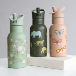 Stylowa dziecięca butelka ze stali nierdzewnej o pojemności 350 ml z motywem zwierząt z sawanny. Oferuje podwójną izolację, trwałe materiały oraz wygodne picie przez ustnik ze słomką. Idealna do przedszkola, szkoły i na wycieczki; z opcjonalną zakręcaną pokrywką można ją zmienić w termos.